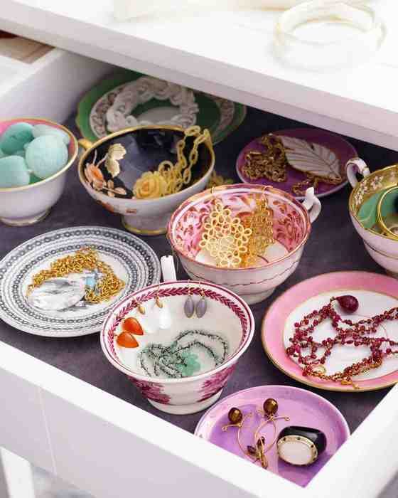 На самых обычных стеклянных бутылках можно хранить браслеты и часы, а вот в чашки и блюдца удобно складывать мелкие украшения, например, серьги и кольца. Достаточно расположить посуду в выдвижном шкафчике или на туалетном столике и распределить украшения по видам, цвету или стилю.