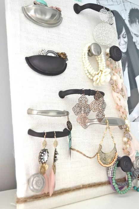Практика показывает, что использование подручных средств может быть очень результативным. Например, для создания органайзера можно использовать молдинги, рейлинги и дверные ручки. И самое главное, что сегодня такое добро не сложно подобрать под любой стиль интерьера. Молдинги и рейлинги можно закрепить прямо на стене или на дверце шкафа, а фурнитуру достаточно разместить на деревянной доске или раме. На ней будет удобно хранить серьги-люстры, браслеты и бусы разной длины.