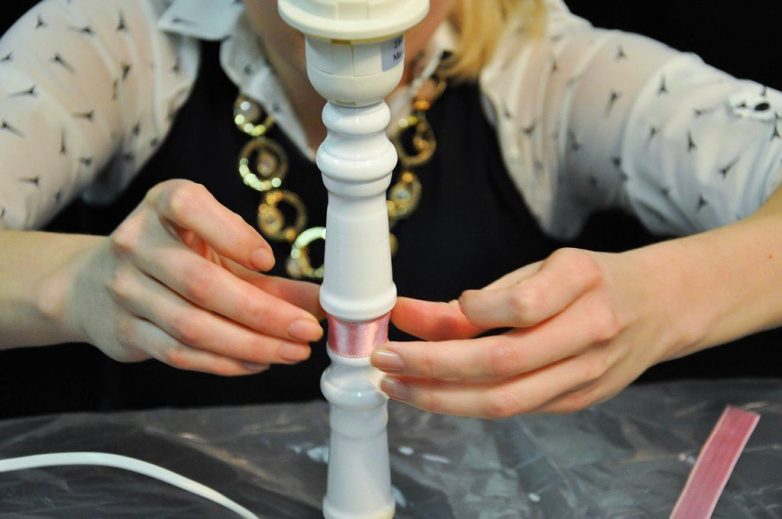 Основание лампы можем также декорировать золотой краской и украсить лентами. Осталось лишь вкрутить лампочку в патрон — и наш весенний светильник готов! Таким образом можно создать своими руками как настольный, так и напольный или подвесной светильник, который сделает ваш интерьер уникальным и неузнаваемым.