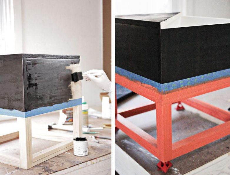 В нашем случае верхняя часть стола была покрыта темной морилкой, а ножки покрашены яркой краской. Чтобы краска не размазалась, пользуйтесь малярным скотчем.