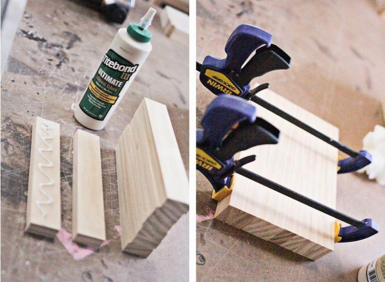 Попарно склейте дощечки 20×4 см и 40×4 см, Зафиксируйте их струбцинами, пока клей не высохнет. Из этих деталей мы изготовим ножки стола.