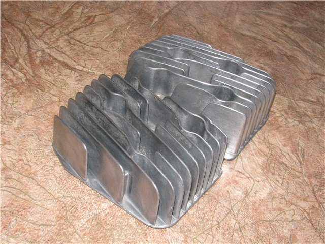 Алюминий отмывал по-разному, некоторые советы с форума Яваолд тоже пригодились. Крышки картеров отмачивал сначала в жидкости для мытья кухонных плит «Милам», зелёненького цвета, потом тёр губкой для мытья посуды. Картера — с ними было уже сложнее, чистил вручную, скотч-брайтом, хотя можно было просто прокипятить в выварке с порошком, что и сделал с правой головкой, в качестве эксперимента. Но всё оказалось не так просто, так как мотоцикл я так понял практически всю жизнь простоял на открытом воздухе, то головки цилиндров оказались особенно окислены между рёбер, вот результат кипячения:
