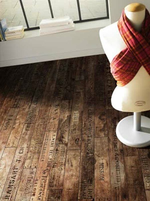 Напольное покрытие, стилизованное под винные ящики.