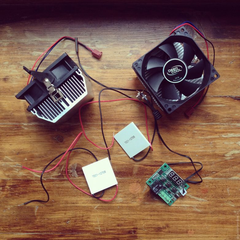 А можно и доработать конструкцию, чтобы получить полноценный холодильник. Для этих целей мы будем использовать элемент Пельтье — термоэлектрический преобразователь, принцип действия которого основан на возникновении разности температур при протекании электрического тока. Именно такие элементы используют в серийных автомобильных холодильниках, а также автомобильных сиденьях с вентиляцией.