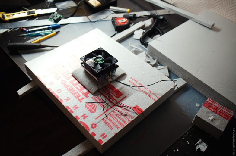 Теперь займемся интеграцией термоэлектрического преобразователя в новую крышку для контейнера. Для удобства размещения всей конструкции увеличим толщину крышки до 100 мм (2 листа пенополистирола). На этой фото хорошо видно прокладку по периметру между двумя радиаторами.