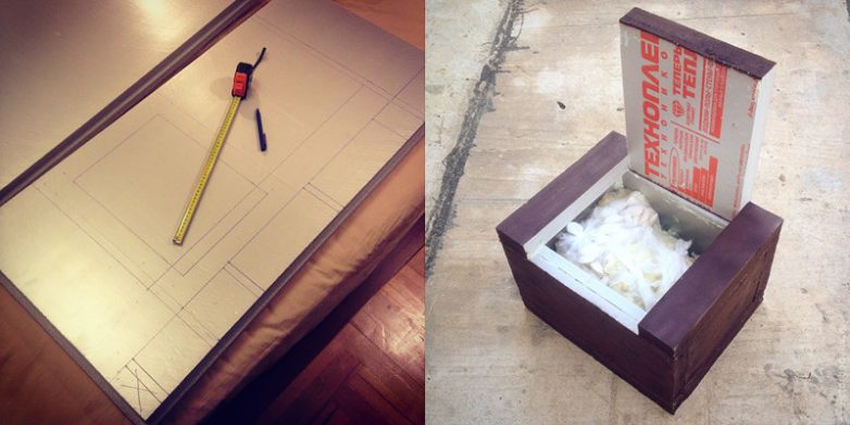 Итак, начнём с контейнера-термоса. Нам потребуется один лист пенополистирола с размерами 1200х600 мм, толщиной 50 мм, канцелярский нож и рулетка. Стоимость такого листа в любом строительном магазине — 160 рублей. Разрезаем лист по шаблону, берем монтажную пену и склеиваем вот такой контейнер.