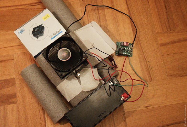 Между собой радиаторы соединяем штатными пластинами крепления к материнской плате, соединив их с помощью пластиковых хомутов. Это позволяет также термически изолировать друг от друга холодную и горячую сторону. Пробный запуск установки. Чем интенсивнее мы будем охлаждать горячую сторону, тем ниже будет температура на холодной стороне. Здесь вентиляторы направлены на приток воздуха на радиаторы, это менее эффективно, чем если их перевернуть на выдув. В импровизированной коробке удалось добиться температуры -3 градуса, при температуре окружающей среды +26. На фото хорошо видна модель кулеров, их преимущество в большой площади опорной площадки радиаторов. А в качестве теплоизоляционной прокладки я использовал кусочек от теплоизоляции для круглых труб.