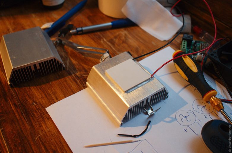 Элемент Пельтье с использованием термопасты (идет в комплекте с кулером) устанавливаем между двумя алюминиевыми радиаторами. Здесь стоит отметить, что можно повысить температурный градиент установки, если сделать сборку последовательно установленных 2 или 3 элементов Пельтье. Таким образом, чтобы один элемент Пельтье охлаждал другой. В таком варианте в контейнере реально получить отрицательную температуру до -18 градусов по Цельсию. По периметру между элементом прокладываем кусочек вспененной теплоизоляции.