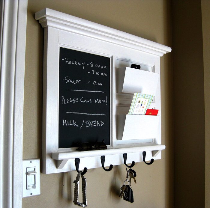 Нередко ключница выполняет несколько функций, является не только держателем для ключей, а и полноценным органайзером для хранения мелочей, почты. Для изготовления такого предмета мебели понадобятся деревянные доски, крючки, по желанию и грифельная краска или готовый самоклеящейся лист с эффектом меловой доски. Расположить ключницу подобного плана можно не только в прихожей, а и на кухне или в гостиной, где каждый член семьи будет оставлять свои записи.