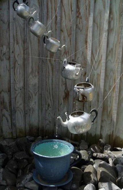Опять же можно было бы начать словами предыдущего раздела о множестве красивых решений, но мы ограничимся перечислением наиболее оригинальных вариантов. Таких, например, как использование чайников в качестве водостоков. Ну вот чем вам это не конструктивные элементы водоотводящей системы? Полые, носатые — любо-дорого посмотреть. Собрали по соседям и родственникам шесть-семь старых железных предметов обихода, подвесили их друг под другом, слегка наклонив, и наслаждайтесь журчанием воды, переливающейся из одной ёмкости в другую. Красота!