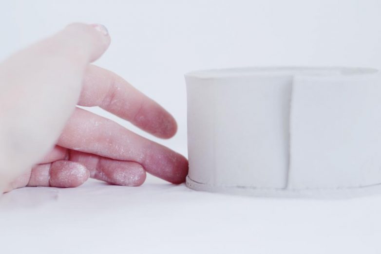 Остатки глины перемешайте и снова раскатайте в длинную узкую полоску. Длина полоски должна быть достаточной, чтобы ее можно было обмотать вокруг стенок контейнера.
