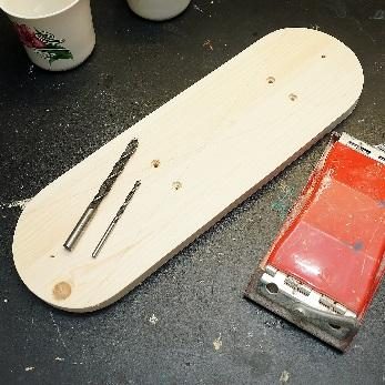 Сверлом по дереву (4 мм) высверливаем отверстия в отмеченных местах. Переворачиваем заготовку и рассверливаем места для гаек сверлом (8 мм) на глубину 3-4 мм. Тщательно обрабатываем дерево наждачной бумагой, особенно торцы.