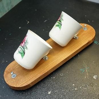 Ручки у кружек обматываем изолентой (2 слоя), чтобы не повредить керамику. Притягиваем кружки к деревянной основе при помощи скоб, винтов и гаек.
