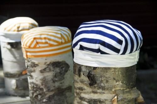Для создания необычных ярких табуретов вам понадобятся лишь небольшие бревна, ткань интересных расцветок, а также любой набивочный материал. Тканевые чехлы, наполненные набивочным материалом можно зафиксировать на бревнах с помощью обычного строительного степлера.