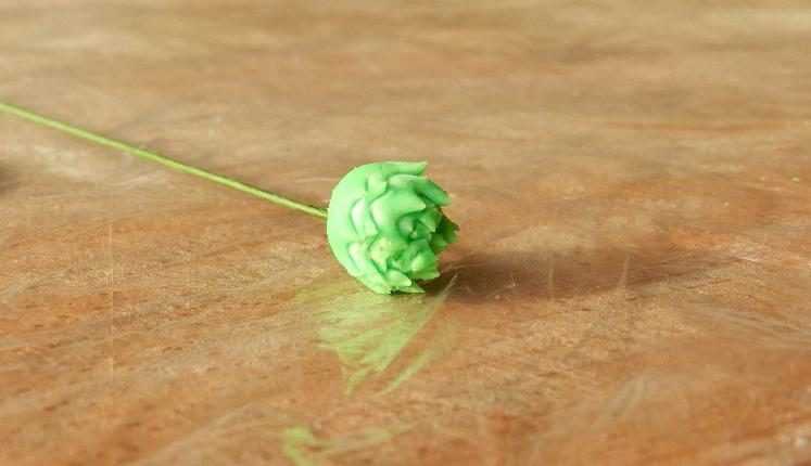 После того, как мы прикрепили завершающий ряд, надо сделать чашелистик. У ранункулюса он состоит из пяти лепестков. Для них я снова беру зеленую глину, которая использовалась для серединки, отделяю от нее небольшой кусочек и формирую из него каплю.