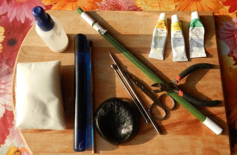 От ярко-зеленого кусочка отщипываем небольшую порцию, размером с ноготь мизинца, скатываем ее в шарик. Проволоку загибаем петелькой, наносим на нее клей и надеваем шарик.