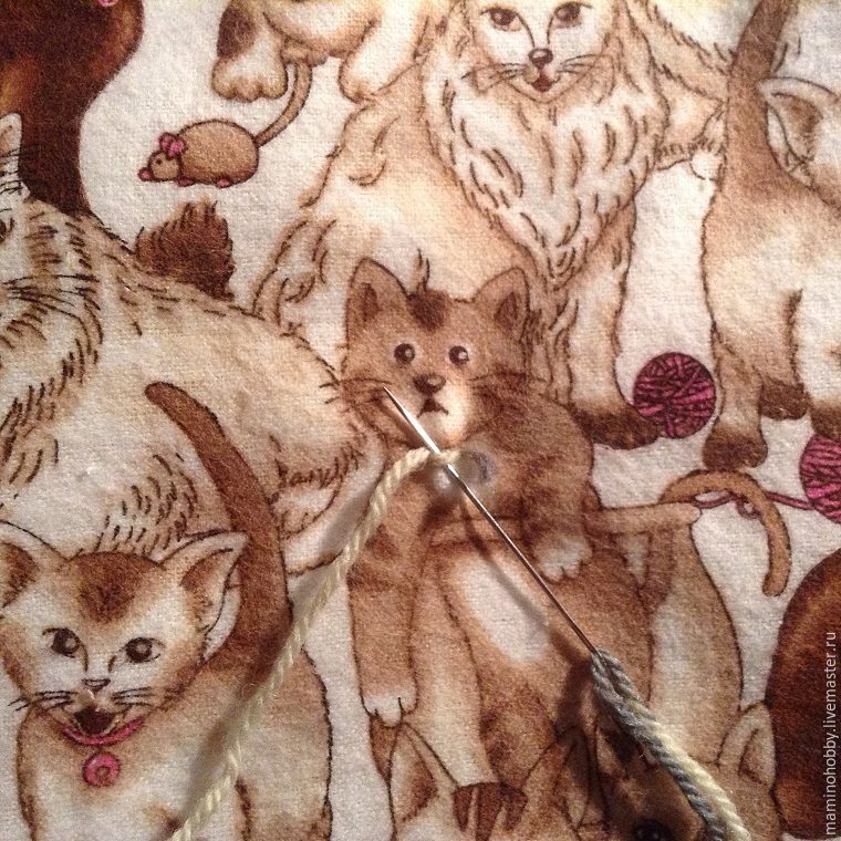 При желании можно полотна одеялка скрепить шерстяной пряжей несложной стёжкой «вприкреп». Сделали пару стежков, закрепили стежком в пряжу, обрезали, распушили хвостики. В дальнейшем эти хвостики заваляются и дополнительно закрепят пряжу: