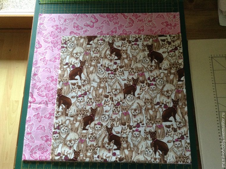 3. Совмещаем середины сторон верха и низа одеялка лицом к лицу, изнаночной стороной вверх. Точно метка к метке. срезы тоже совмещаем. Здесь показываю совмещение меток, поэтому срезы один под другим. У вас должны быть край в край.