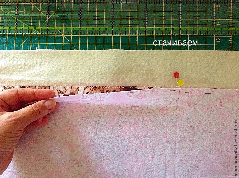 В расправленном виде совместили верх и низ одеялка и закрепили булавками. Показываю на примере одеялка в кроватку, то есть без утеплителя. Так мы закрепляем обтачку и обе стороны одеяла перед утюжкой и отстрочкой.