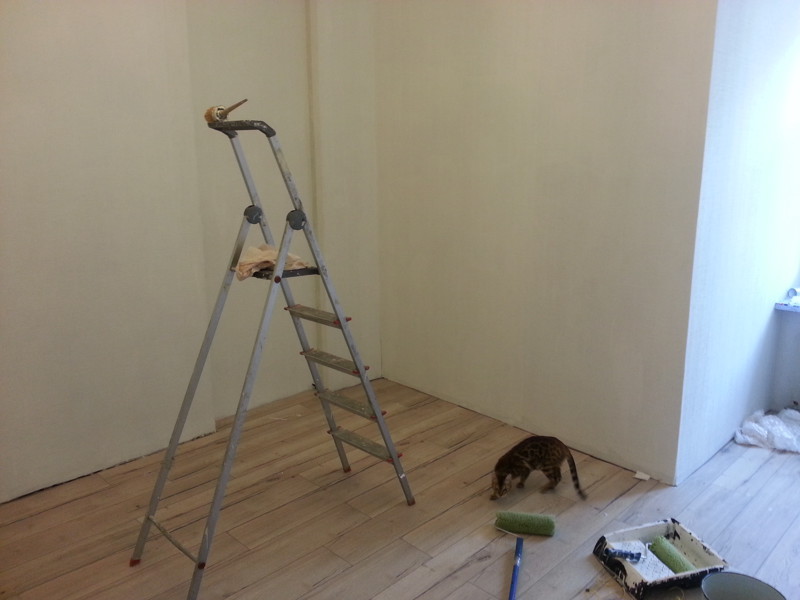 Первым делом был куплен теплый инфракрасный пол и новый ламинат. Все постелено, все работает. Под будующим шкафом пленки естественно нет… Кошка сразу теплый пол оценила по достоинству) Обои и потолок обновлены)