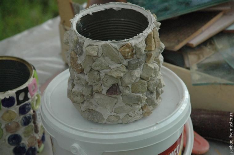 Мозаика — самый доступный способ творчества вместе с детьми! Например, мы собрали все бусинки, которых маме было не жалко, а за воротами дачи на дороге собрали белый дорожный гравий, в сарае немного битой плитки, которая остается от любого ремонта. За основу для кашпо взяли жестяные банки из-под краски и корма для животных. Так, чтобы после высыхания клея банка не меняла своей формы. В дне банки гвоздем проделали отверстия, досыпали дренаж и высадили несколько кустиков. Хочу сказать, что кашпо с обычными дорожными камешками мне понравилось больше всего, а ведь его делал ребенок 3-х лет. И просто, и живописно. Про клей для кашпо стоит сказать отдельно, я его использовала впервые и пока нареканий нет, держит превосходно — текстура, как у латексной шпатлевки, и толщина нанесения может быть в палец, что удобно, когда работаешь с мозаикой из разнообразных материалов. Стоимость 240р.