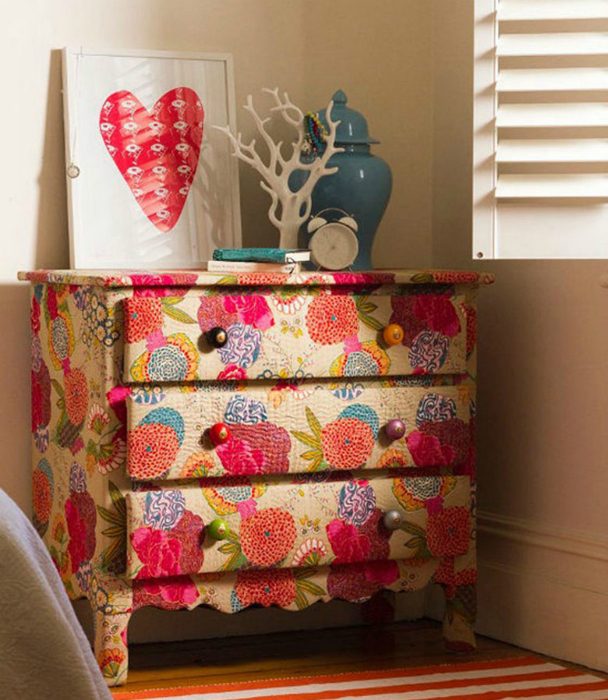 Старый комод можно украсить росписью, самоклеющейся пленкой или по технологии декупаж.