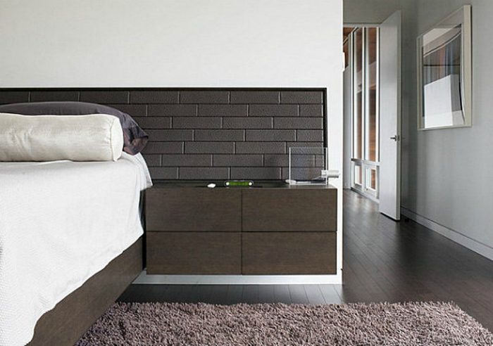 Изголовье кровати, стилизованное под кирпичную кладку.