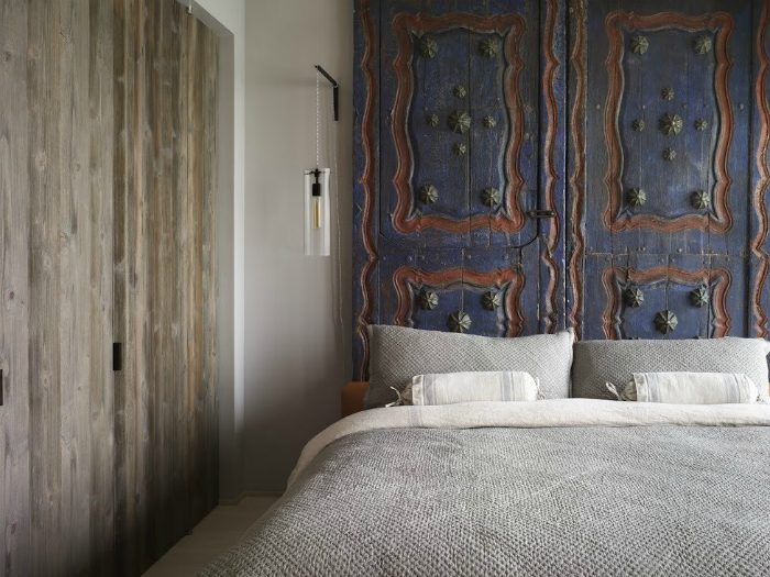 Деревянная дверь, стилизованная под старину, добавит спальне изысканности и таинственности.
