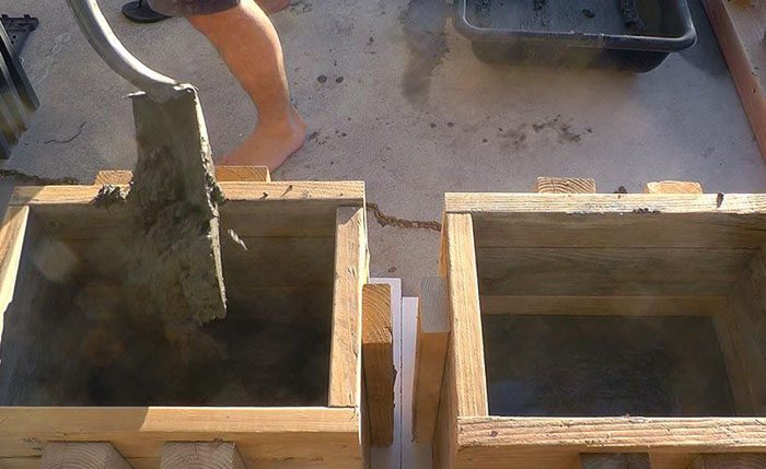 Заполняем формы до конца, периодически используя лопату и палку, чтобы подталкивать влажный бетон вниз в углы форм. Поскольку верхняя часть форм будет дном для бетонных блоков, то верхний слой бетона можно и не затирать, а просто выровнять его один раз стяжкой.