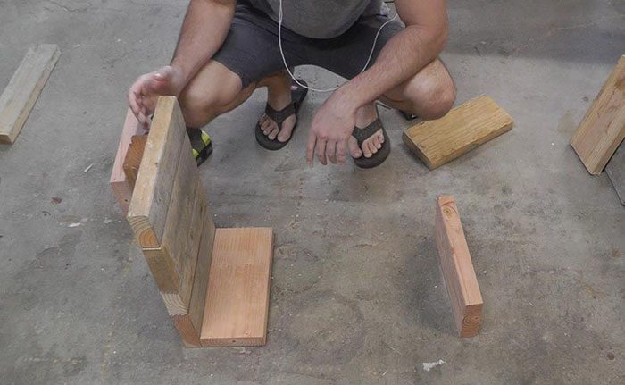 Важно, чтобы два бетонных блока были одинакового размера, а выемки для досок были тоже выровнены. Все части можно выпилить или подровнять с помощью циркулярной пилы. Как только все части готовы, их нужно собрать в панели.
