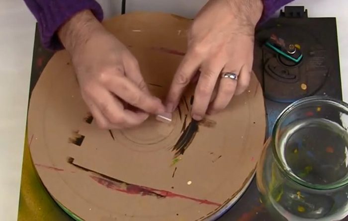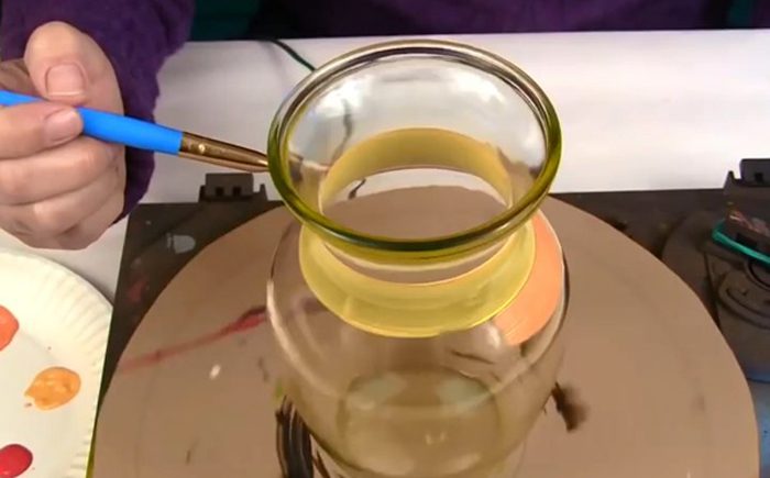 Поочередно обмакивайте кисть в разные цвета эмали и подносите ее к вращающейся вазе.