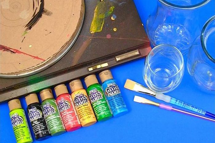 Возможно, вы удивитесь, но понадобится старый проигрыватель. Загляните на чердак или в комиссионный магазин, чтобы раздобыть подходящий экземпляр. Кроме того, нам нужна глянцевая эмаль всевозможных цветов, картон, клейкая лента, обычные, самые простые стеклянные вазы разной величины и формы, медицинский спирт, кисточки для рисования.