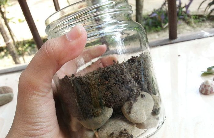На дно банки насыпьте слой камешков, его высота не должна превышать 3 см. Они послужат дренажом, предотвращающим переувлажнение почвы.