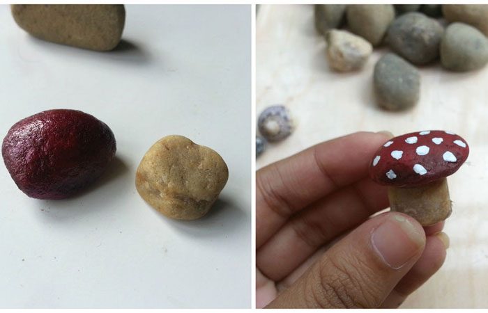 Затем нужно подобрать небольшие камешки, чтобы выложить ими дно. Можно покрасить маленькие камешки плакатными красками, чтобы они выглядели как миниатюрные грибочки, например, мухоморы. После того, как краска высохнет, покройте ее слоем прозрачного лака для ногтей, чтобы она не стиралась.