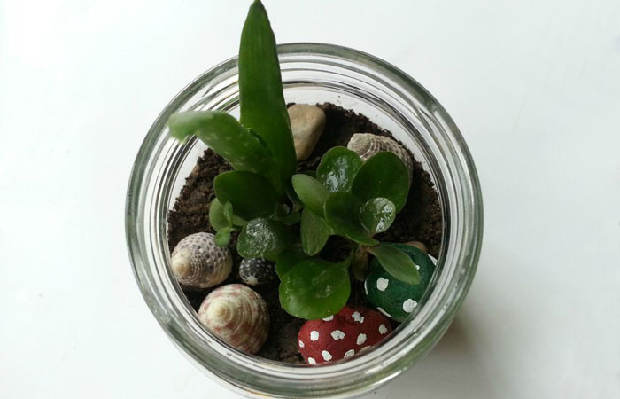 После посадки добавьте к композиции раскрашенные «грибы», ракушки и мелкие камешки, разложив их вокруг растений. Не нагромождайте слишком много элементов, оставьте, как минимум, 1 см свободного пространства вокруг каждого растения.