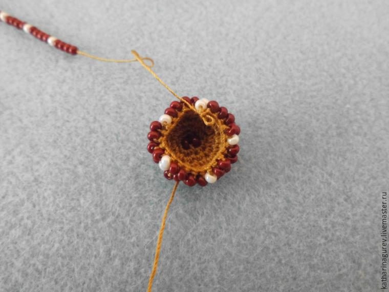 Следующие 4 ряда вяжем по тому же принципу, прибавления делаем после каждой светлой бисерины. То есть — провязываем светлую бисерину, из следующей петли предыдущего ряда провязываем две новых с темными бисеринами. Остальные бисерины провязываем без прибавлений, таким образом в каждом ряду у нас получается на 5 бисерин больше, чем в предыдущем.