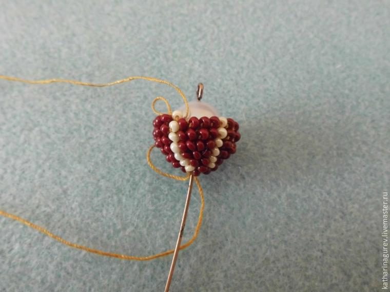 Надеваем наше вязание на бусину-основу и, начиная со следующего ряда, вяжем с убавлениями. Для того, чтобы в процессе вязания не потерять отверстие бусины — можно вставить в него штифт или кусочек проволоки.