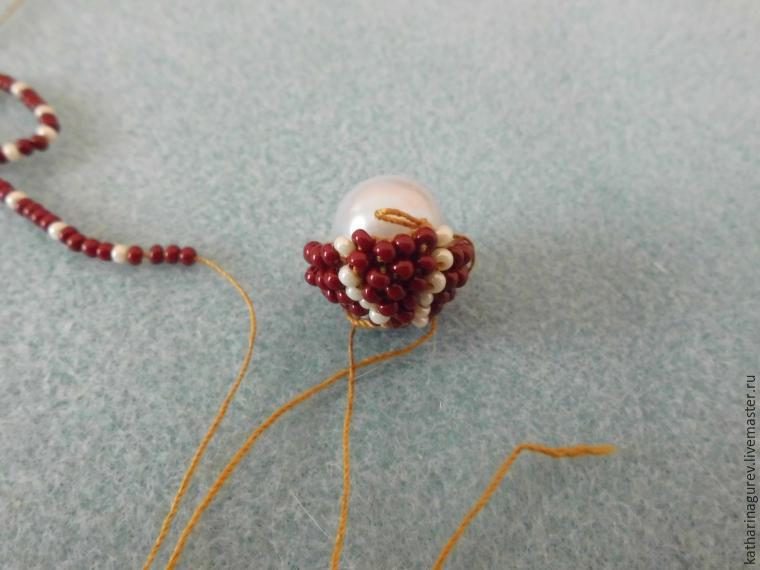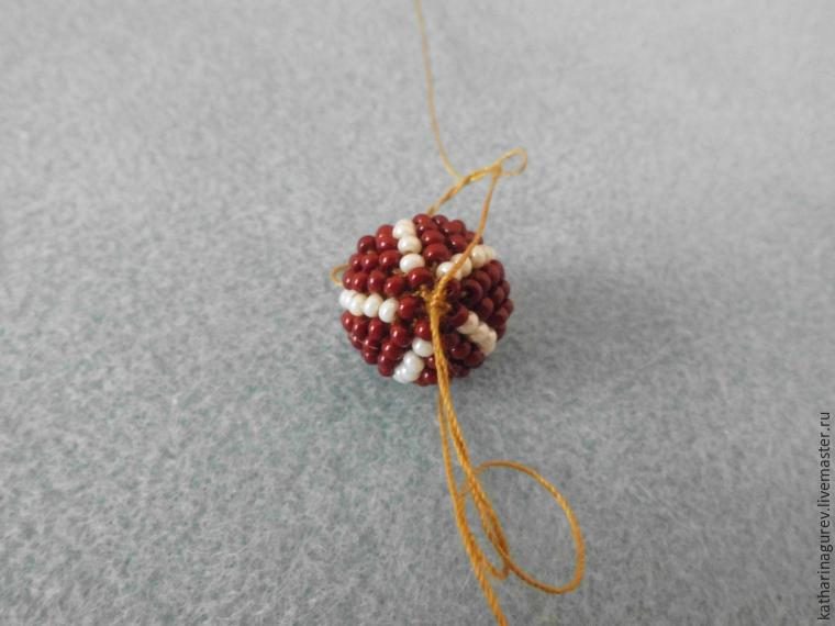 На этом этапе вязания примеряем будущую бусину к бусине-основе. Если до этого можно было не понять как вязание ложиться на основу, то сейчас уже все стало понятно и видно. Самое время подправить, если что-то не так.