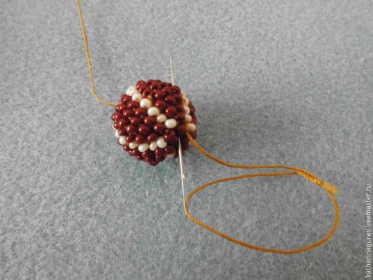 Оба конца нитки при помощи иголки прячем внутрь бусины. Бусина готова.
