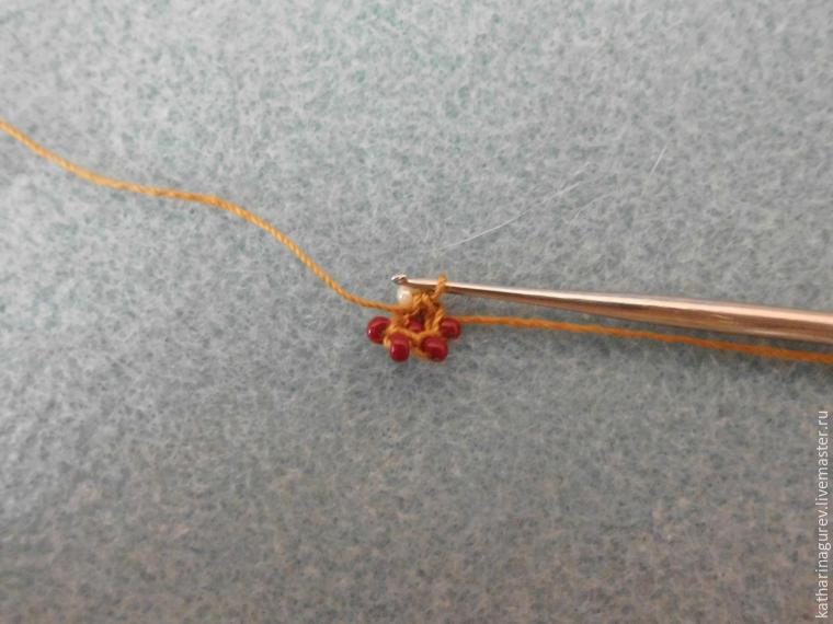 Таким же образом провязываем еще 4 петли с бисером. В итоге должна получиться «цепочка» из 5 бисерин.