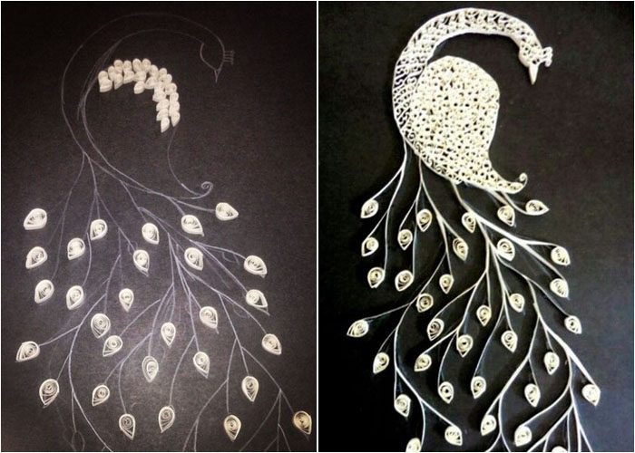 Сделайте эскиз павлина (тело и перья) на плотной черной бумаге. Это поможет сориентироваться, сколько закрученных роллов понадобится, а также облегчит наклеивание. Для изготовления туловища павлина понадобится приблизительно половина всех полосок. Они должны быть закручены и сжаты в форме капли. Как только закрутите необходимое количество полосок, разложите их согласно эскизу и убедитесь, что их достаточно для заполнения рисунка. Приклейте их клеем.