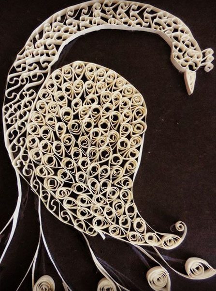 Для изготовления шеи павлина, воспользуйтесь техникой квиллинга «улей». Это потребует немного времени и усидчивости. Аккуратно, по очереди приклейте каждую полоску.