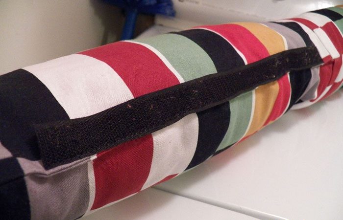 Обшейте по периметру (с 3-х сторон) верхнюю часть наволочки с лицевой стороны полосками липучки (если это лента Velcro, то ее петлевой частью). Здесь будет крепиться валик.