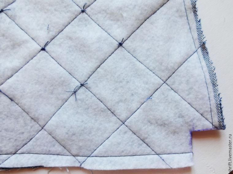 Обе стороны сумки простегиваем с синтепоном линиями под углом друг к другу. На задней стороне располагаем карман. Притачиваем в край.