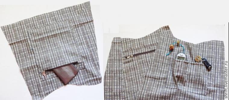 Выкроим подкладку по основной выкройке. На одной стороне оформим накладной карман на молнии, так как сумка будет закрываится только на клапан. На второй стороне кармашки для телефона, ключей. Сшиваем боковые стороны подкладки (низ не застрачиваем).