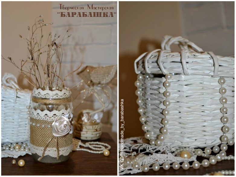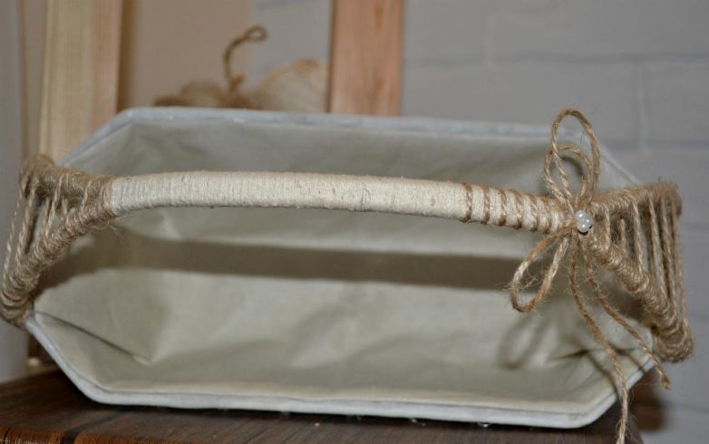Также, разместили бусины по краю корзинки на кружеве и обмотали корзинку шпагатом.