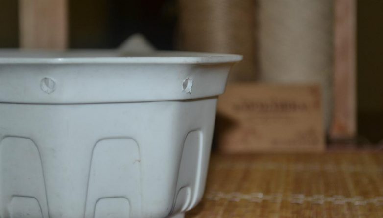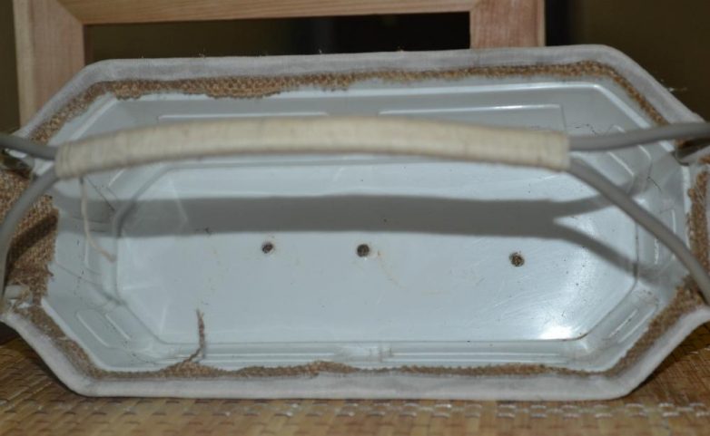 И так вначале мы берем обычный пластиковый цветочный горшок и делаем отверстия на местах, где будут ручки у корзинки.