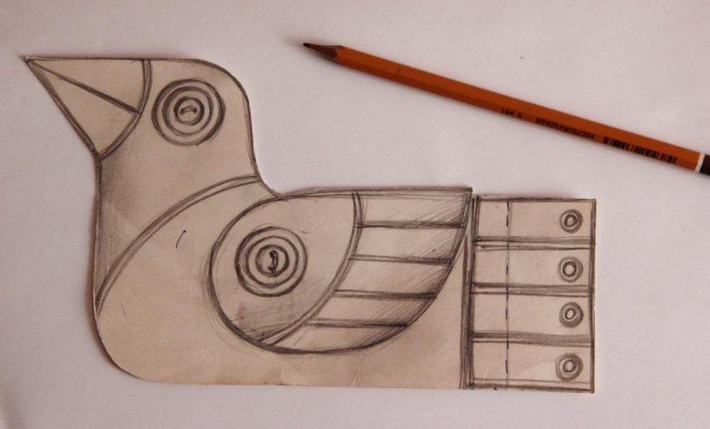 Шаг первый. Выкройка из бумаги (формат А4) размером 20 см х 12 см дана без припуска на шов. Основные элементы — туловище и крыло. Перенесите эту сороку на листок бумаги. Обратите внимание на мелкие детали игрушки: клюв, крыло и хвост. Все линии на эскизе должны присутствовать.