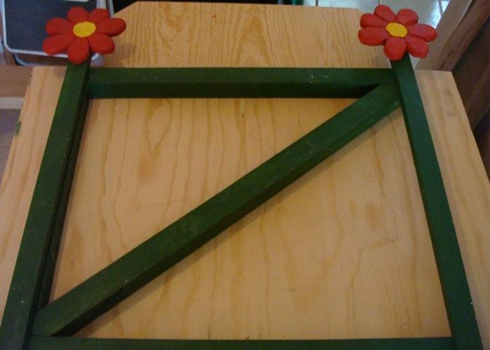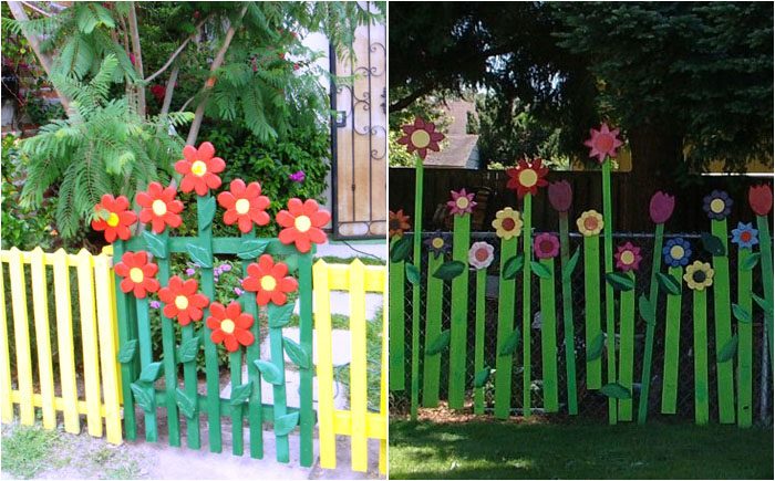 Сначала необходимо закрепить 2 штакетины по краям. Затем разложите остальные по желанию. Разложите листья. Сначала просверлите дрелью отверстия и прикрепите листья к стеблям с тыльной стороны. Затем так же прикрепите стебли к каркасу. Некоторые цветы можно крепить всего лишь в одном месте, в зависимости от высоты стебля.