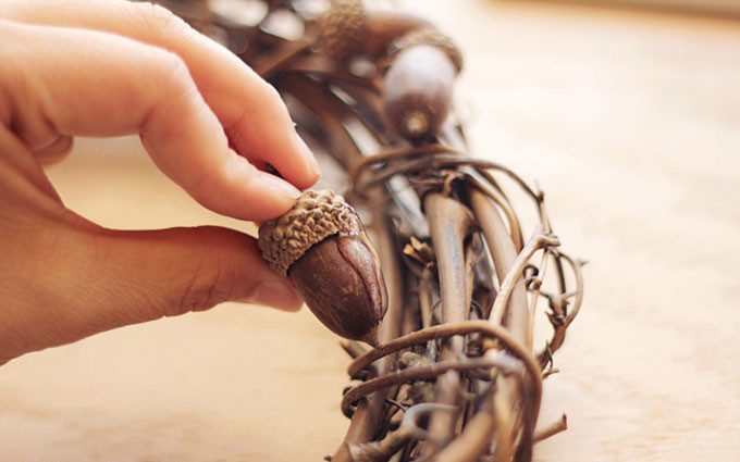 Когда основа сделана, можно приступать к украшению. Для этого подходят яркие листья, колоски, жёлуди, сухие яблоки или ягоды. Лёгкие элементы на длинных ножках прикрепляются с помощью проволоки, ниток или зубочисток, а небольшие и тяжёлые приклеиваются.